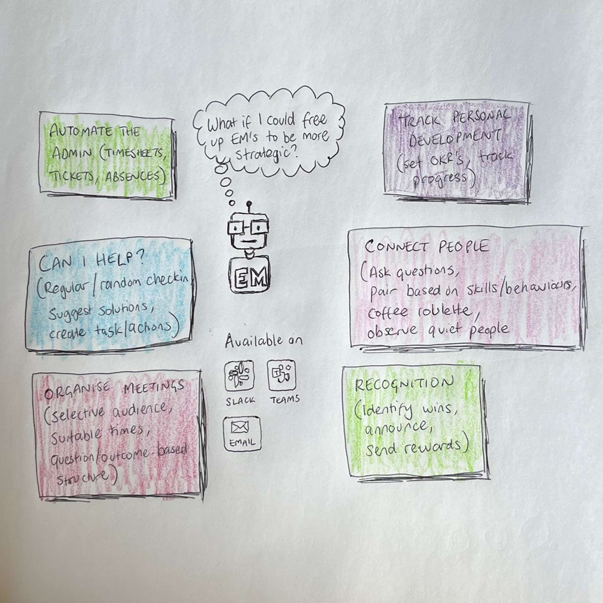 This month, I had a moment of inspiration thinking about what I actually do in my role as an Engineering Manager and how much of it could possibly be automated as an EM Bot.